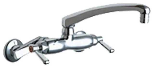 The Chicago 445-L8E35ABCP Manual and Metering Faucet. This hot/cold water sink faucet features a 3-3/8″ body with adjustable arms, from 3″ to 8-3/8″, a set of 2-3/8″ lever handles, and an 8″ L-Type swing spout. It comes with a 1.5 GPM aerator, a Quaturn compression cartridge, and a 2-1/2″ offset supply arm with 1/2″ NPT female thread inlet. This faucet comes with a 2-5/16″ diameter slip flange, and it comes in a bright, Chrome finish.