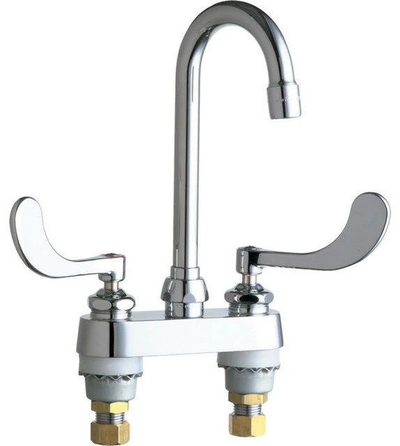 The Chicago 895-317ABCP Manual and Metering Faucet. This hot/cold water sink faucet features 4″ fixed centers, a 3-1/2″ rigid/swing gooseneck spout, and a set of 4″ wristblade handles. It comes with a Quaturn compression operating cartridge, a 2.2 GPM aerator, and 1/2″ NPSM supply inlets and coupling nuts for 3/8″ or 1/2″ flexible risers. It comes in a bright, Chrome finish.
