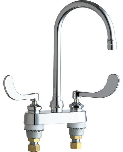The Chicago 895-317GN2AE3ABCP Manual and Metering Faucet. This hot/cold water sink faucet features 4″ fixed centers, a 5-1/4″ rigid/swing gooseneck spout, and a set of 4″ wristblade handles. It comes with a Quaturn compression operating cartridge, a 2.2 GPM aerator, and 1/2″ NPSM supply inlets and coupling nuts for 3/8″ or 1/2″ flexible risers. It comes in a bright, Chrome finish.