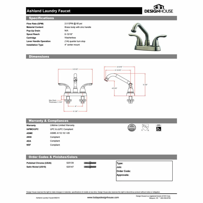 The Ashland Laundry Faucet features a threaded spout and a dual handle design. This faucet accents laundry rooms and countertops with its timeless, quality design. Durable ceramic cartridge contains wear-resistant ceramic plates to prevent corrosion from water flow. This faucet has a brass body, zinc handles and a water flow of 2.4-gallons per minute. Wash garments and fabrics with ease underneath this high vaulted faucet. This faucet’s 4-inch center mount is perfect for laundry and utility rooms.Design House 525147 Features: