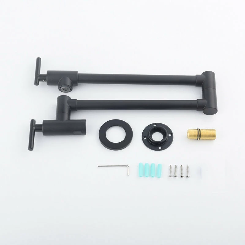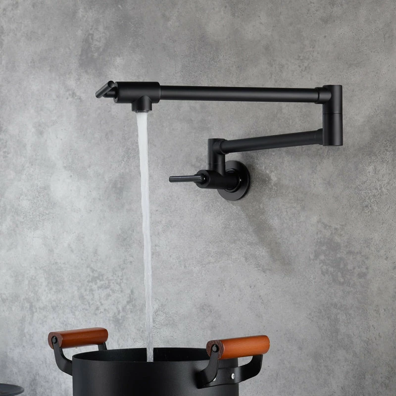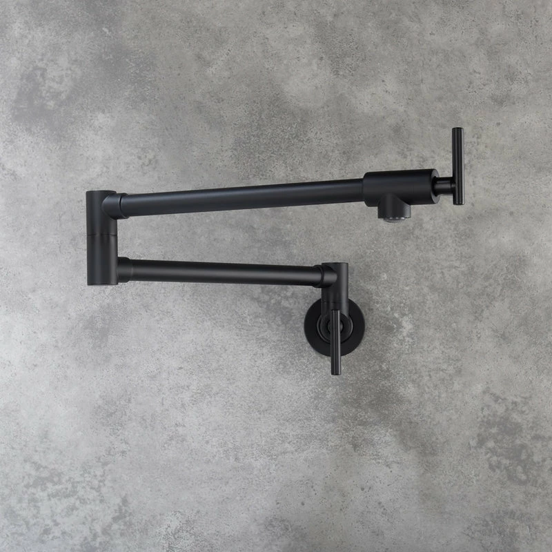 This collection boasts bold, sleek design with its metal handles. The unique construction of these pot-fillers with their sturdy brass material, ensuring long-lasting function and durability, allows for an extended reach through use of their foldable swing arms. Pot-fillers are useful gadgets placed directly above the stove, providing easily accessible water. This is an excellent tool to quickly, easily, and stylishly fill pots, eliminating strain on joints.