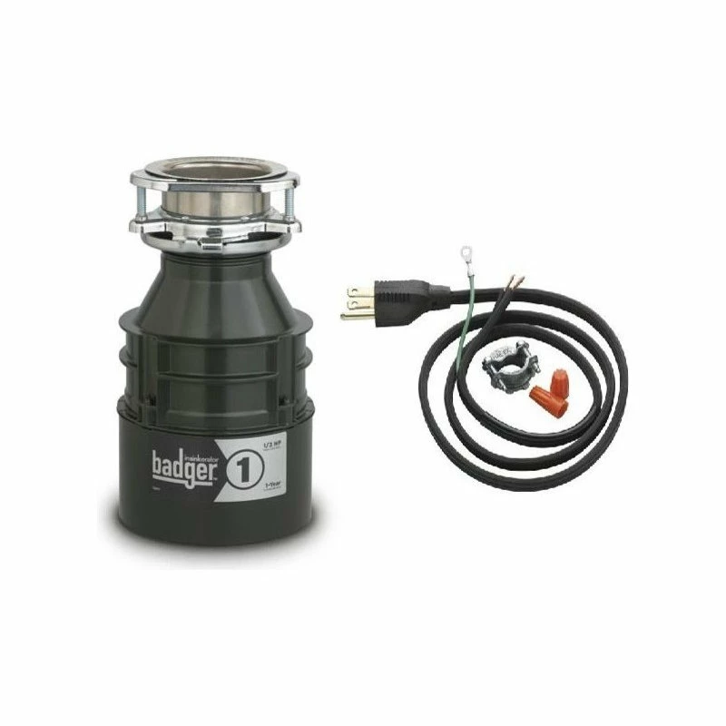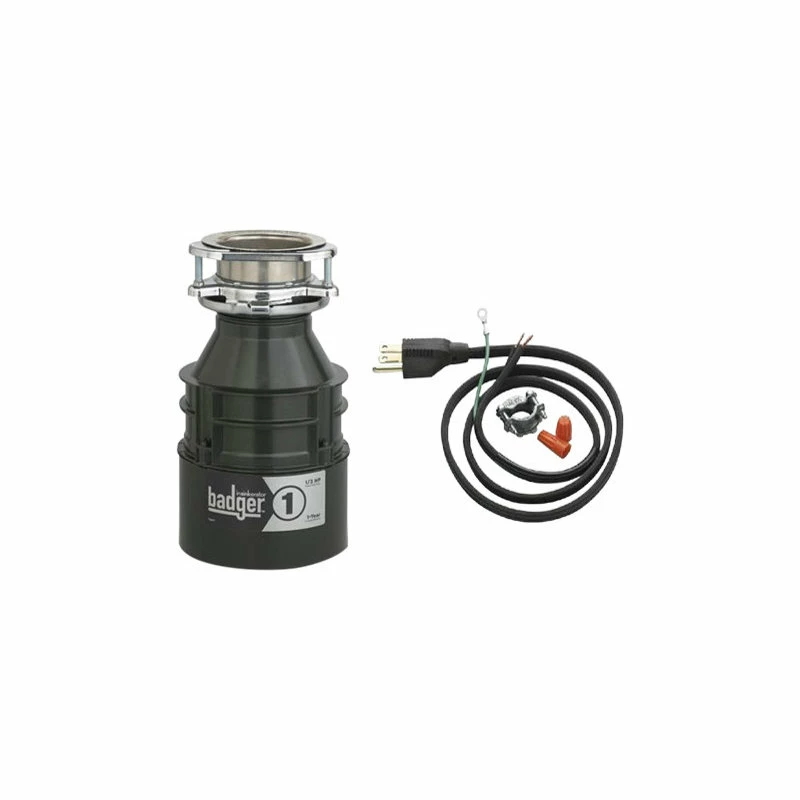 The Insinkerator Badger-1 1/3 HP Disposer with Cord. This Badger1 disposer provides a perfect combination of a heavy-duty motor with a space-saving, compact design, allowing you to use it virtually anywhere for anything! It features a 1/3 HP heavy-duty Dura-Drive induction motor, a rugged galvanized steel construction, and a 1-1/2″ cushioned slip joint connection for an easy installation.
