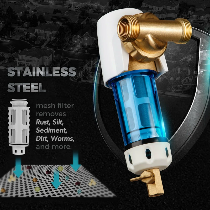 - High impact stainless steel mesh filter screen. Double threads on both ends: 1 inch MNPT and 3/4 inch FNPT, 1/4″ flush out fitting included.