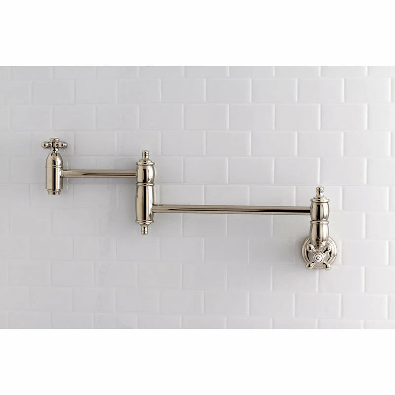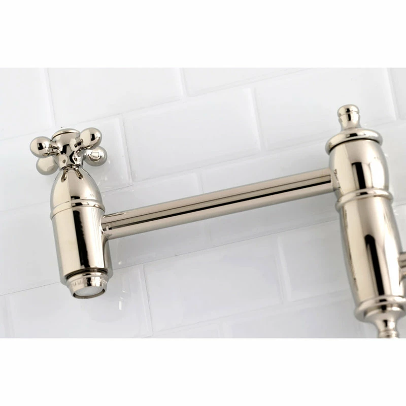 Classical artistry from the late 19th Century to the early 20th Century is mirrored beautifully within this faucet’s traditional charm. As an excellent tool to quickly, easily, and stylishly fill pots, eliminate strain on your joints. Pot-fillers are useful gadgets placed directly above the stove, providing easily accessible water. The foldable swing arms of this pot filler allow for extendable reach of up to 20″ of length and provide long-lasting function due to their sturdy brass construction. Additionally, the dual handles prevent unwanted water spillage while enhancing the traditional theme. Kingston Brass KS310.AX Features: Covered under Kingston Brass’ 10-year limited warranty Constructed of brass Coordinates with products from the Restoration line seamlessly Dual cross handles Kingston Brass KS310.AX Specifications: Height: 8″ Width: 15″ Faucet Hole: Single Faucet Hole Size: 1-1/4″ Spout Reach: 13″ Flow Rate: 3.8 gallons per minute Connection Size: 1/2″