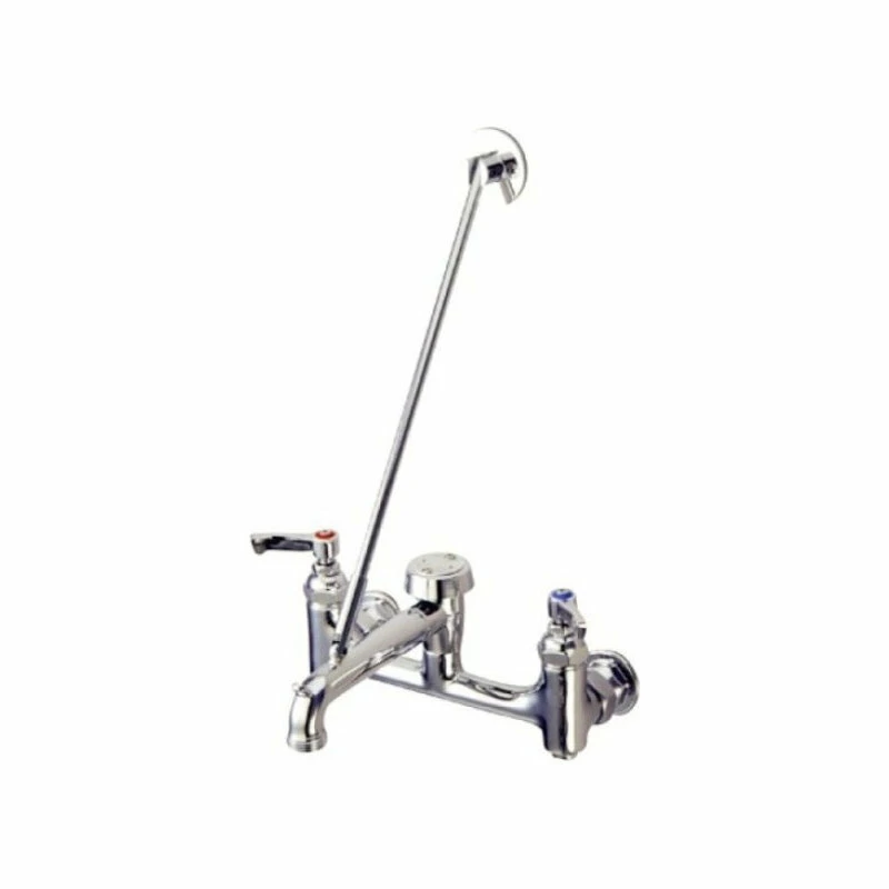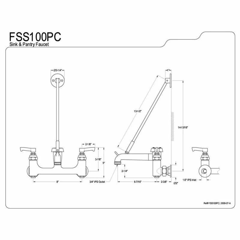 The sink and pantry faucet features a rigid 7″ spout supported by a 13-1/2″ wall support and flange. The faucet has two lever handles for water volume and temperature control and is constructed in solid brass for durability and reliance.Manufacturer: Kingston BrassModel: FSS100PCUPC: 663370002809Product Name: Sink & Pantry FaucetCollection / Series: Plumbing partsFinish: Polished ChromeTheme: GenericMaterial: BrassType: FaucetFeatures: Constructed in high quality brass for durability and reliability