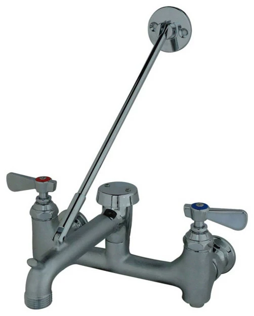 The laundry faucet features a rigid 7″ spout supported by a 13-1/2″ wall support and flange. The faucet has two lever handles for water volume and temperature control and is constructed in solid brass for durability and reliance.
