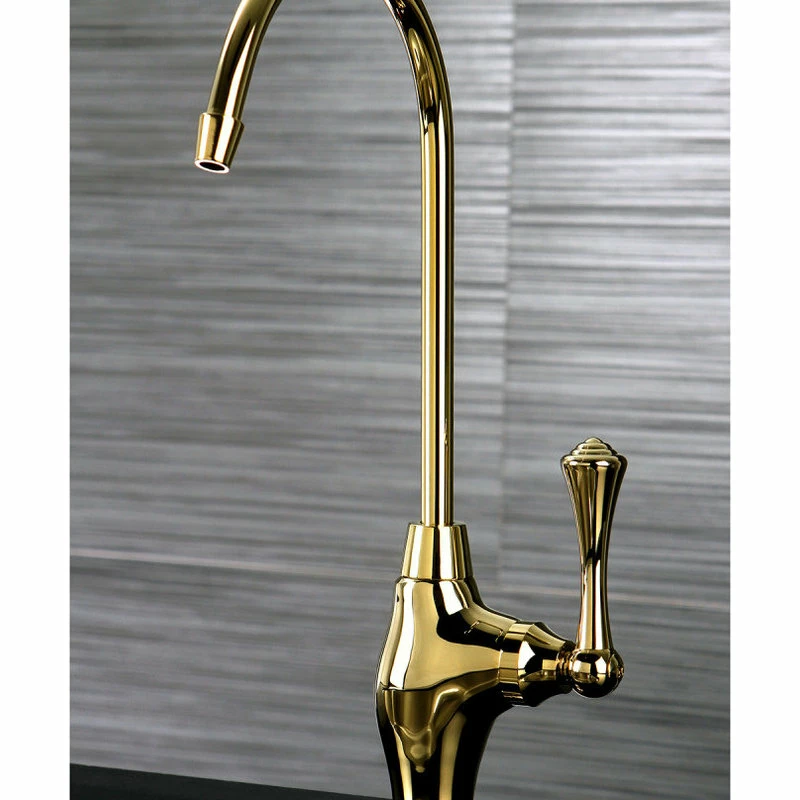 Allow this faucet to provide you with instant, crystal clear drinking water while reducing plastic waste. Ergonomically designed, it will enhance your kitchen’s traditional theme while adding functionality. Use with an under the counter water filtration system.FeaturesSolid brass material for durability and reliabilityDrip-free ceramic disc cartridge14 turn ONOFF water control mechanismDeck mount single-hole installation2.0 GPM7.6 LPM water flow rate at 60 PSI14″ compression inlet3″ shank install height, can be installed on countertops up to 2-12″ thick10-1316″ spout heightSingle lever handle meets ADA guidelinesInstallation Single HoleCollection VintageTheme TraditionalMaterial BrassFinish Polished BrassFaucet Holes 1Drain Included NoHandles Included TRUENumbers Of Handles 1Handle Style LeverProduct Size 11 x 4.75 x 1.75Made In Taiwan